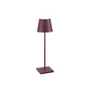 Lampada da tavolo poldina Pro bordeaux, Lampada ricaricabile da tavolo Zafferano, compresa di base di ricarica a contatto, con corpo in alluminio verniciato, diffusore in policarbonato e fonte luminosa a LED. La lampada si accende e si spegne tramite un pulsante touch posto sulla sommità del diffusore; con lo stesso pulsante è possibile regolare la temperatura di colore della luce (2200K, 2700K o 3000K) e l'intensità del flusso luminoso. La lampada possiede inoltre un grado di protezione IP65 che la rende adatta sia all'uso interno che esterno. La durata della batteria è garantita per almeno 12 ore. DIMENSIONI: ALTEZZA 380 mm DIAMETRO 110 mm.